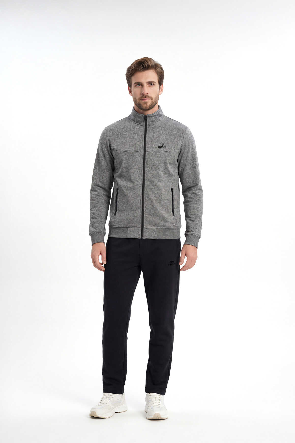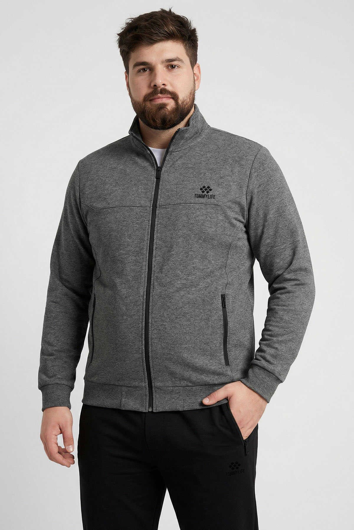 Ürün Adı : Tommy Life Toptan Antrasit Melanj - Siyah Dik Yaka Klasik Paça Büyük Beden Erkek Eşofman Takım - 85176