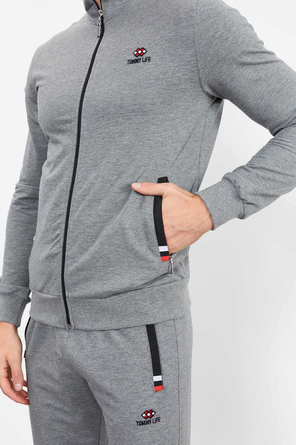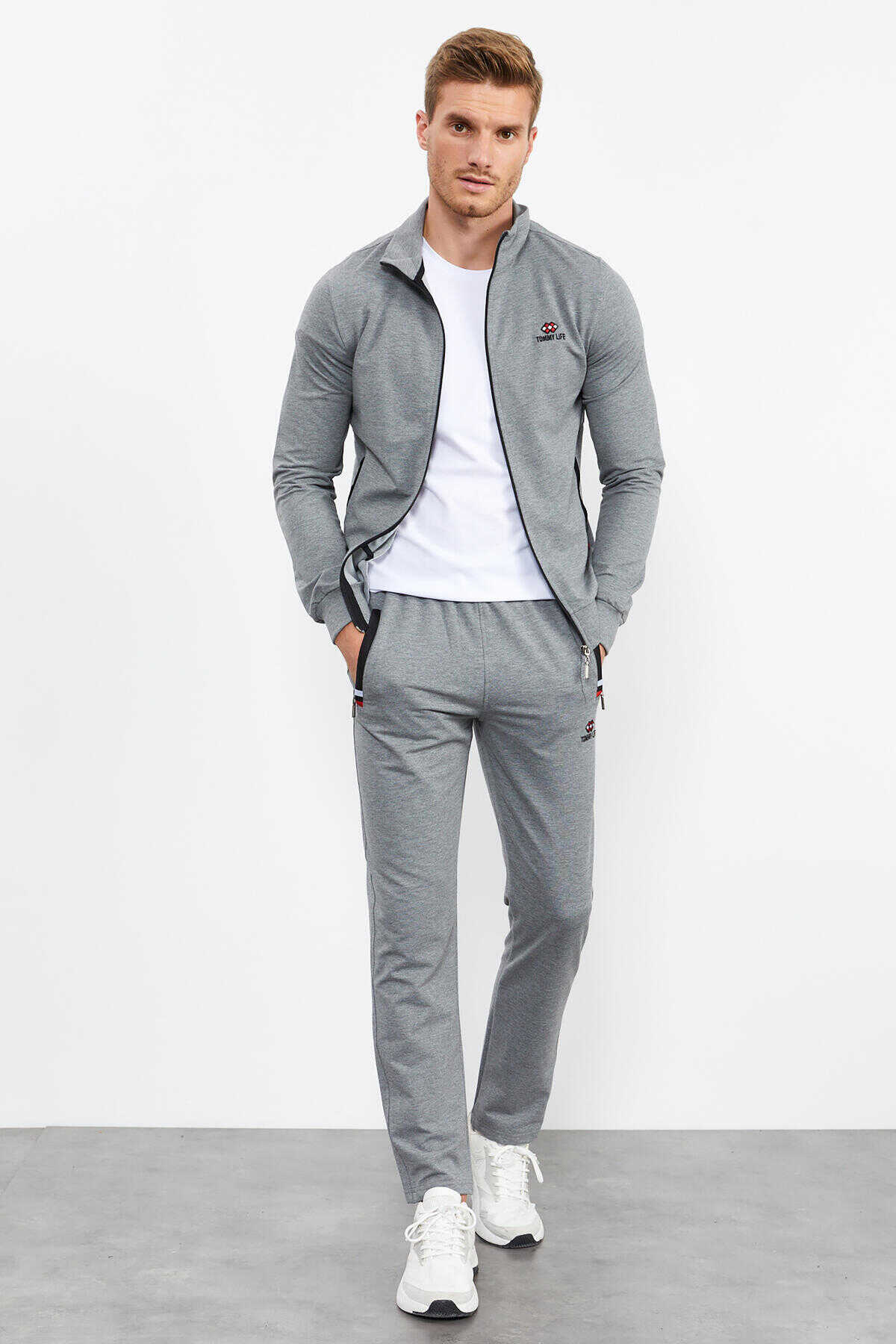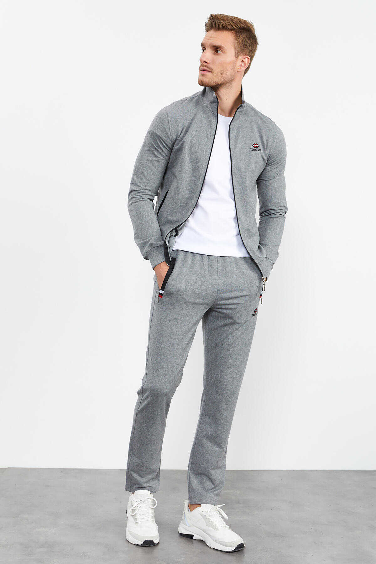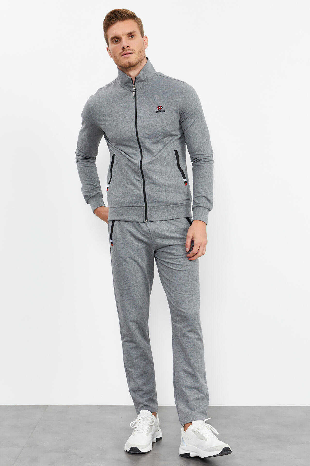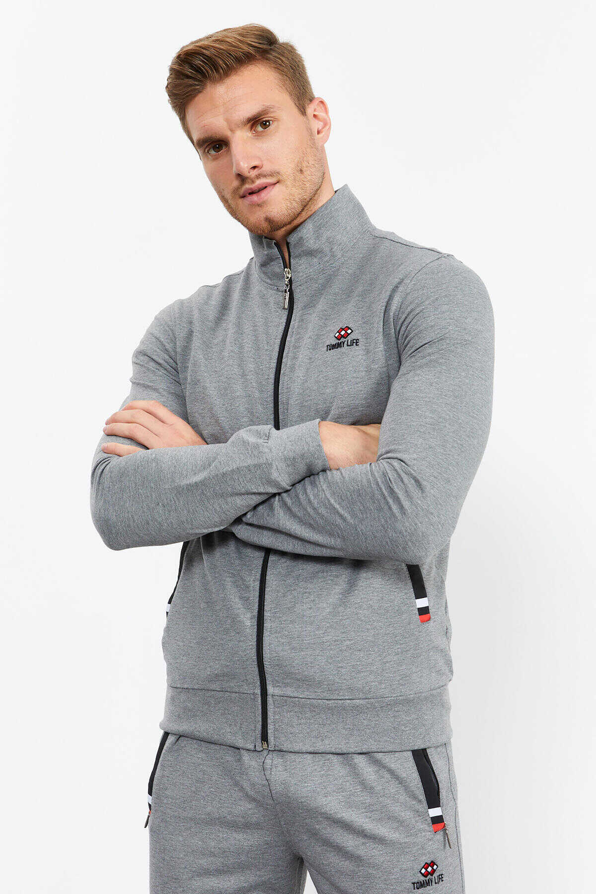 Tommylife Toptan Gri Melanj Dik Yaka Fermuarlı Rahat Form Klasik Paça Erkek Eşofman Takımı - 85072