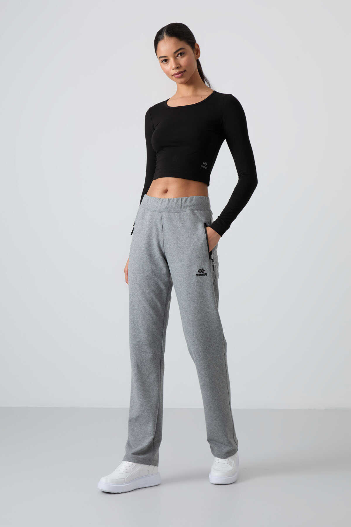 Tommylife Toptan Gri Melanj Fermuar Cepli Rahat Form Klasik Paça Kadın Eşofman Alt - 94195