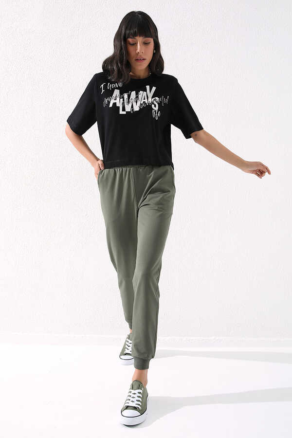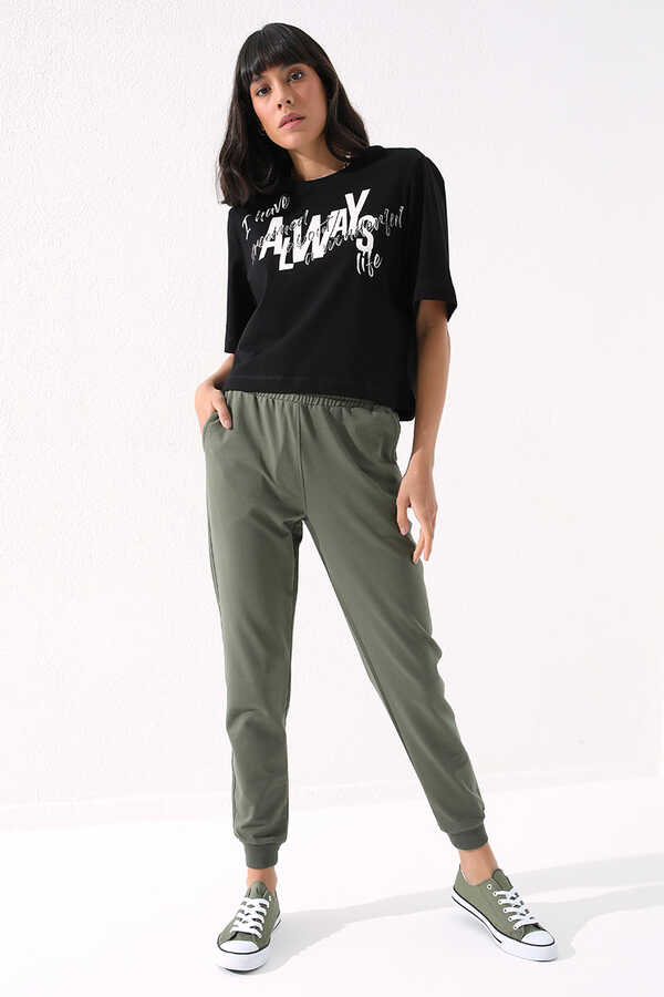 Tommylife Toptan Haki Yüksek Bel Jogger Rahat Form Manşetli Kadın Eşofman Alt - 94561