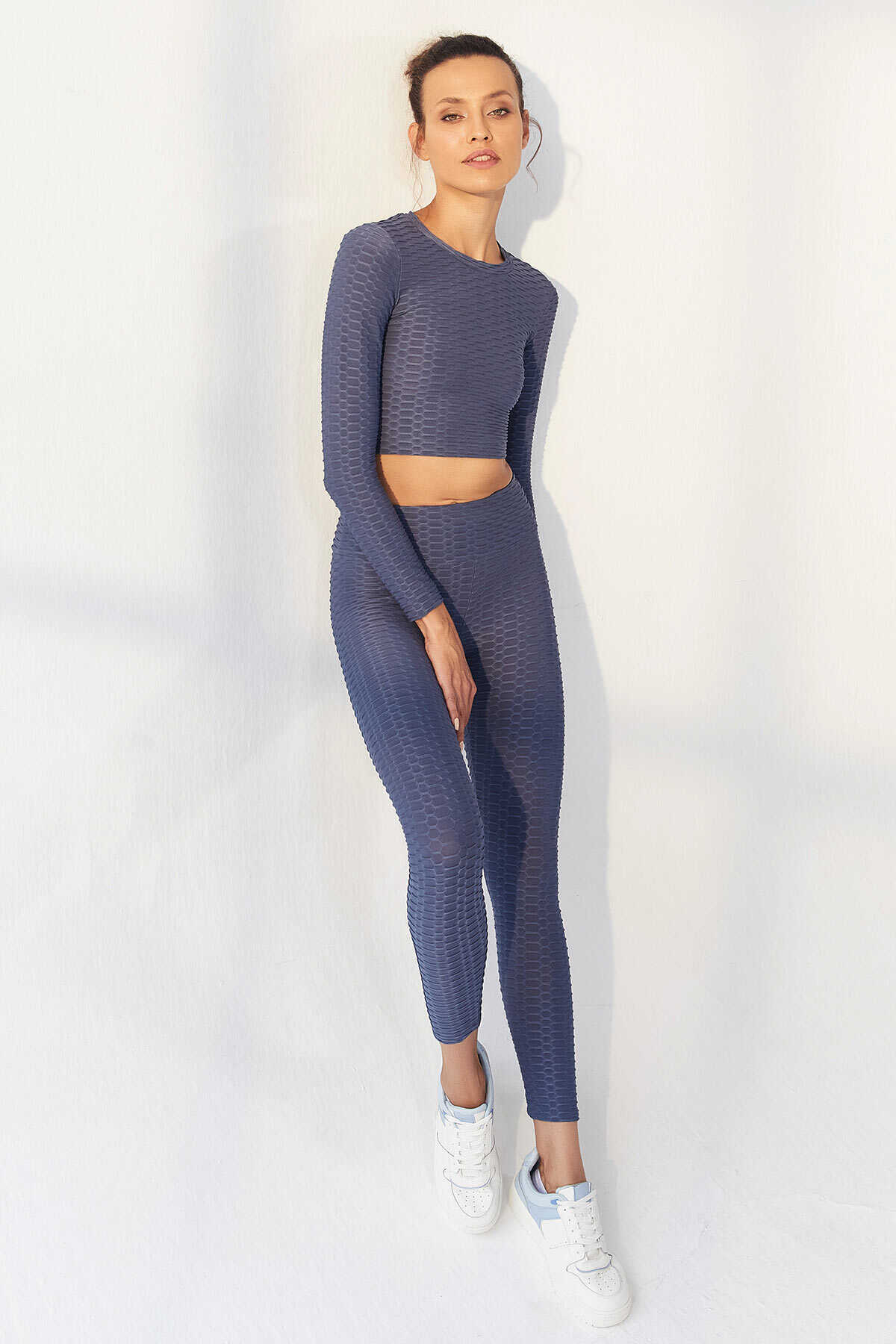 Ürün Adı : Petrol Kendinden Desenli O Yaka Uzun Kol Kadın Crop Top T-Shirt