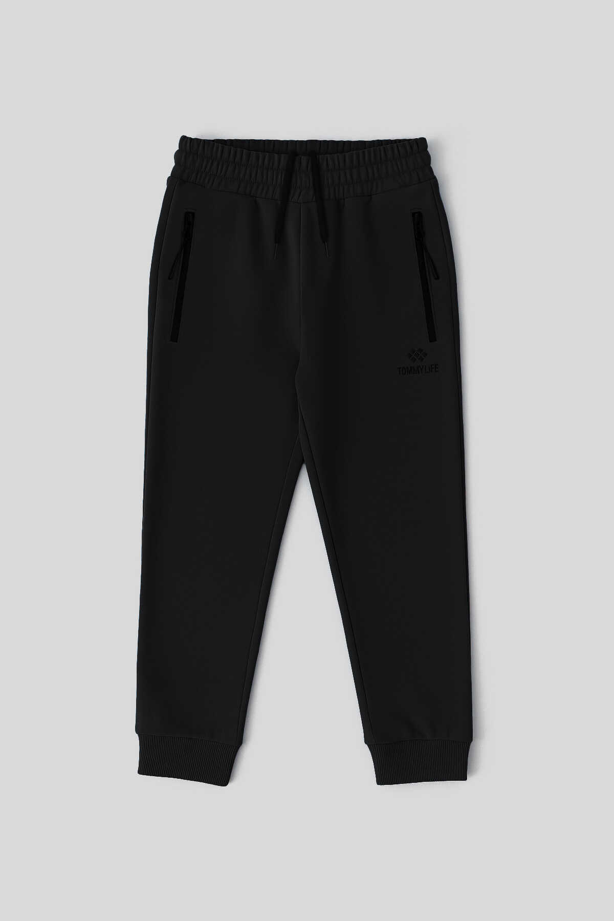 Tommylife Toptan Siyah Basic Fermuar Cepli Belden Bağcıklı Jogger Erkek Çocuk Eşofman Alt - 10798