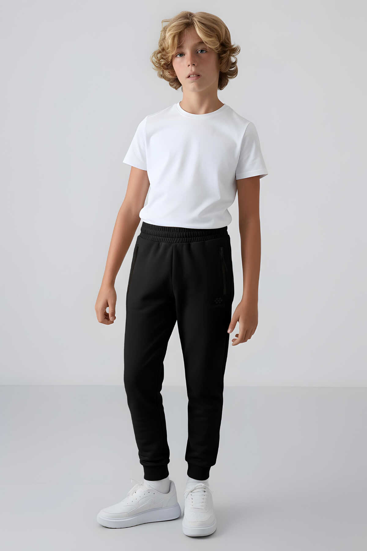 Tommylife Toptan Siyah Erkek Çocuk Jogger Fermuarlı Cep Standart Kalıp Manşetli Eşofman Alt - 64042