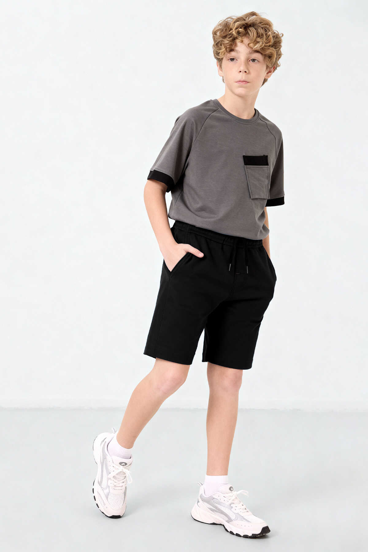 Tommlife Toptan Siyah Standart Fit Bağcıklı Erkek Çocuk Şort - 11284
