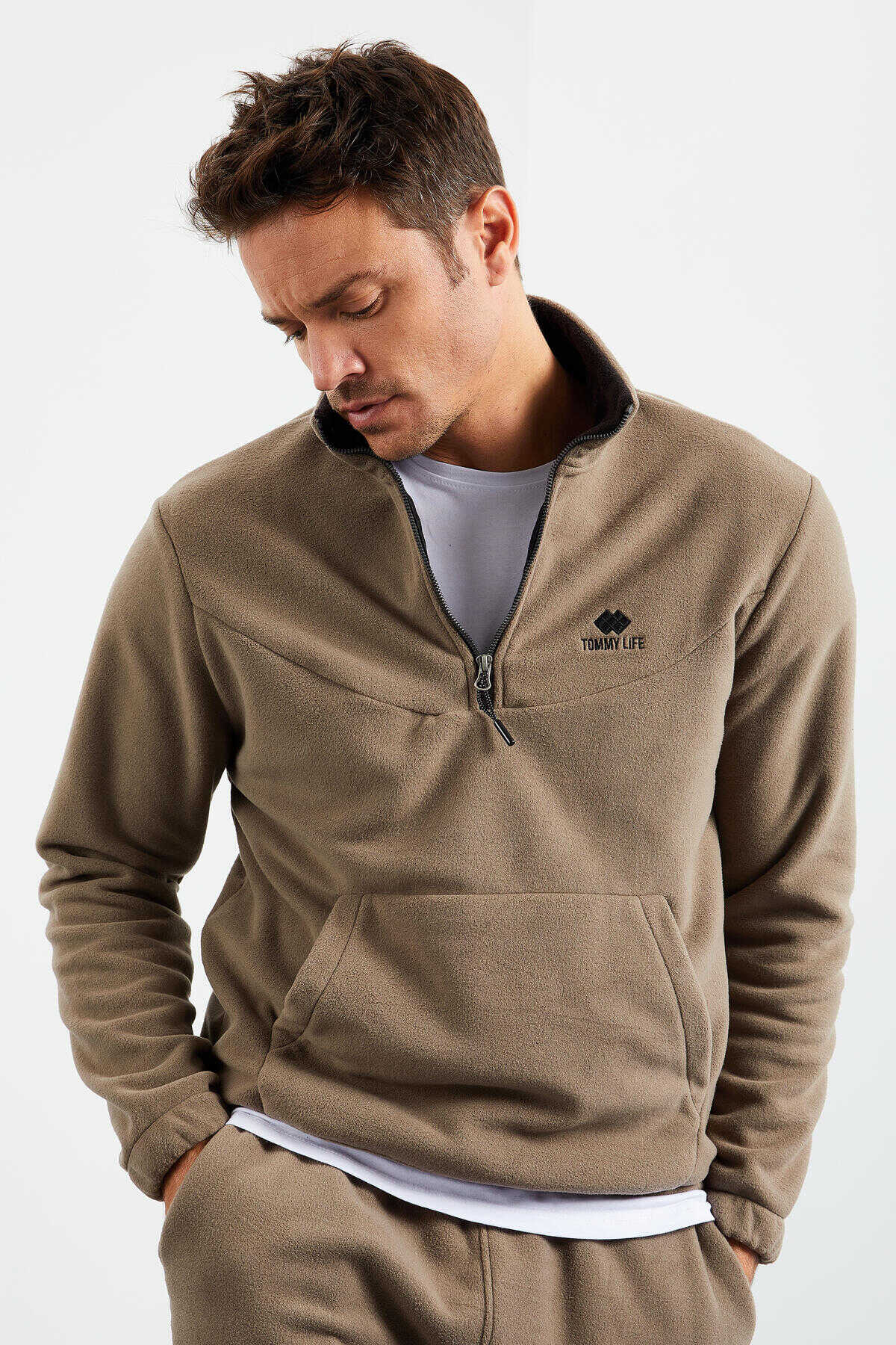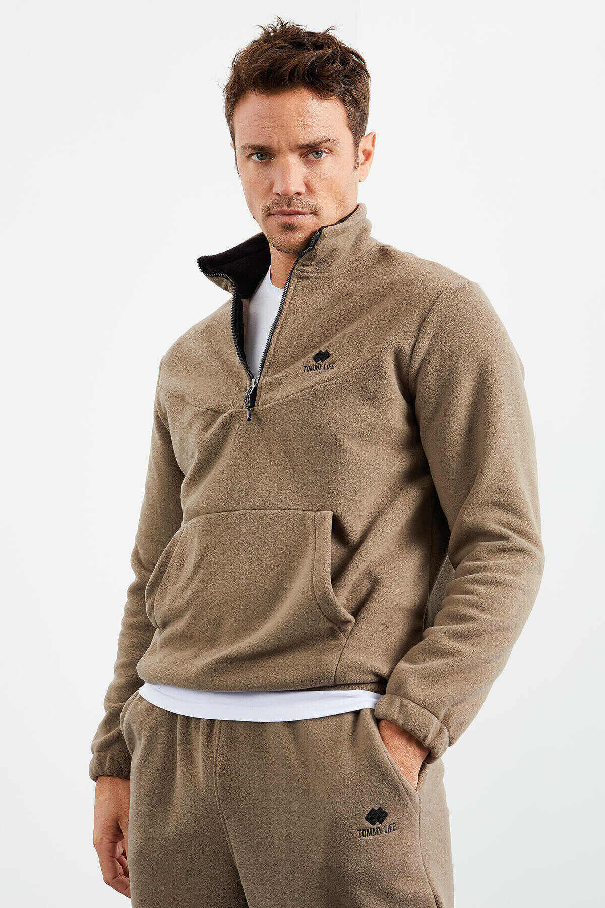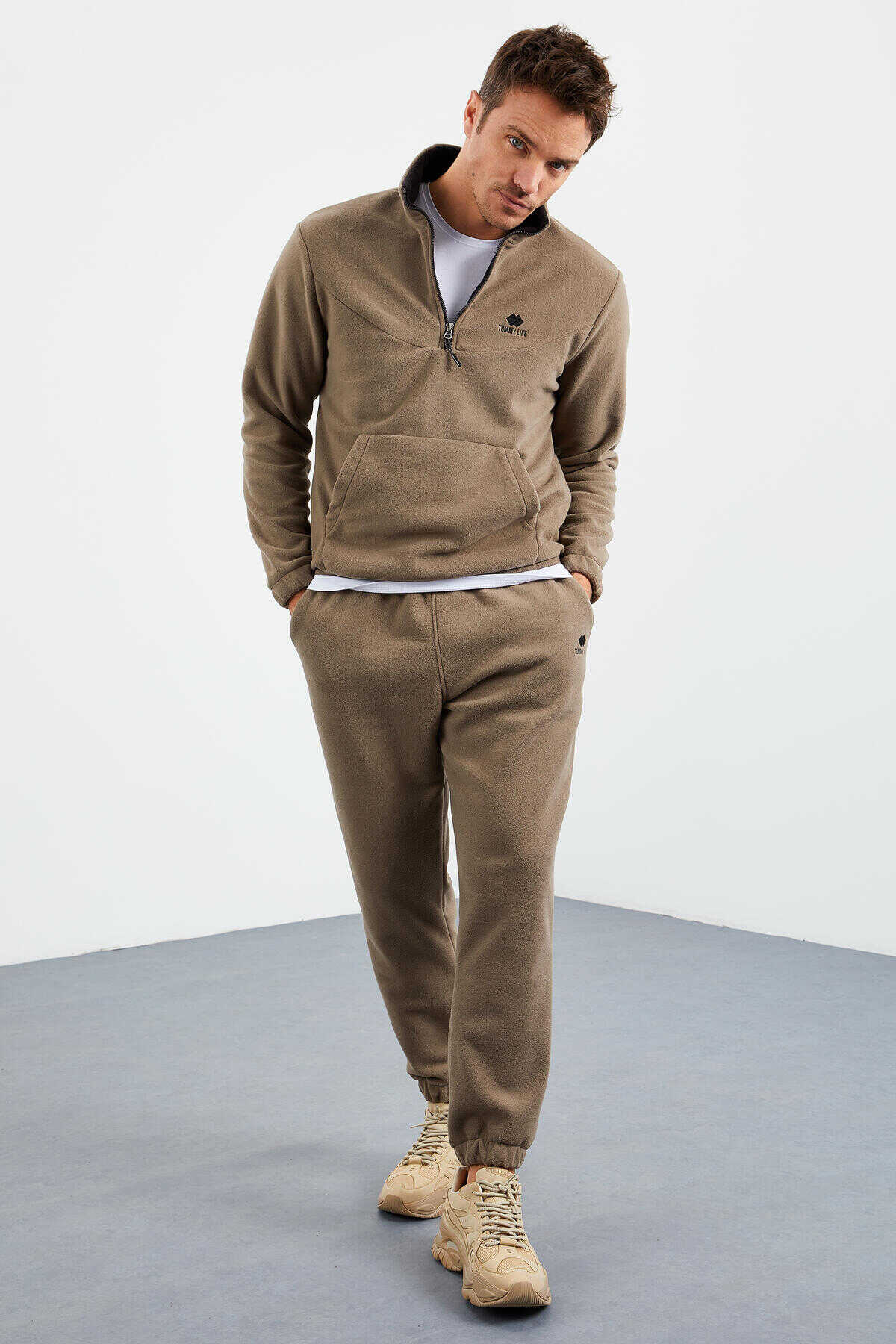 Tommylife Toptan Standart Kalıp Yarım Fermuar Polar Erkek Eşofman Takımı 85159 Camel