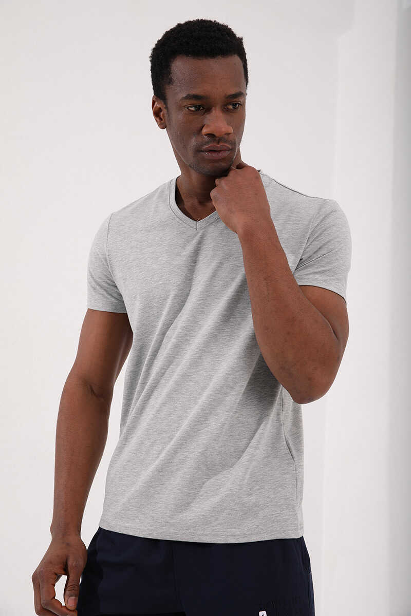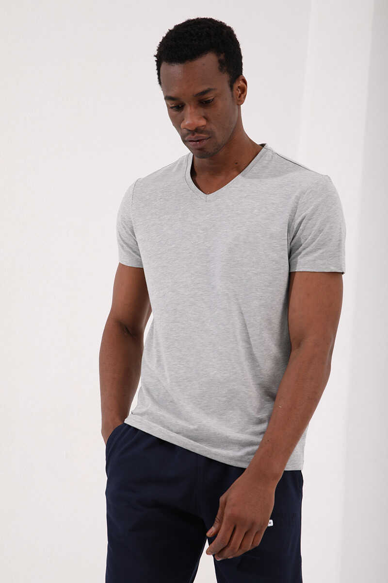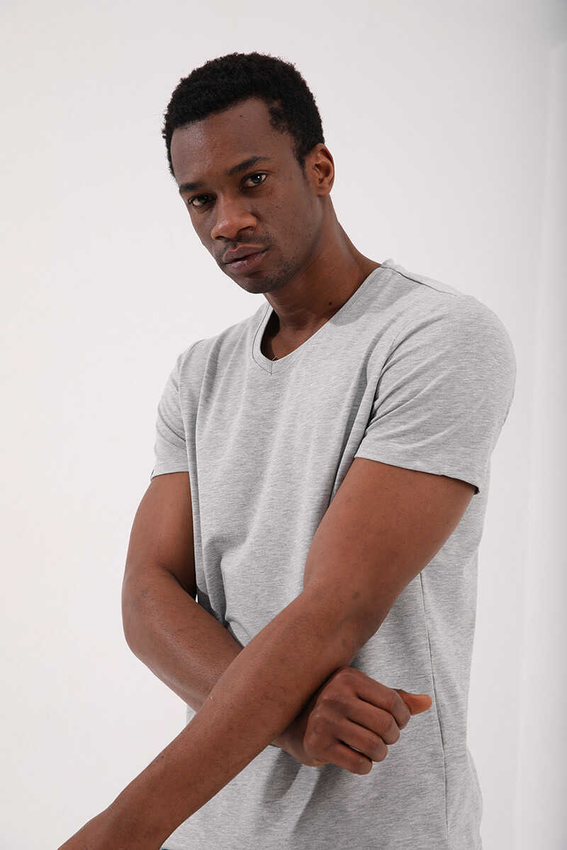 Tommylife Toptan V Yaka Standart Kalıp Basic Erkek T-Shirt 87912 Gri Melanj