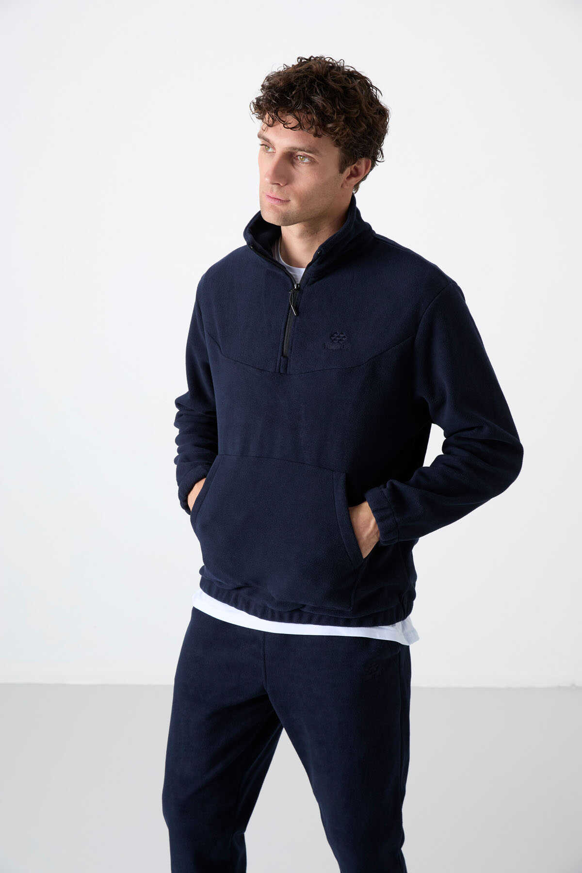 Tommylife Wholesale Navy Blue With Half Zipper Neckband Elastic Hem Men's Fleece Set - 85159